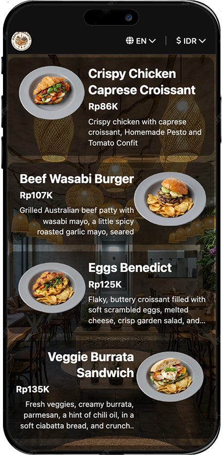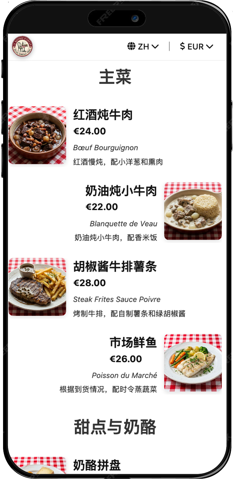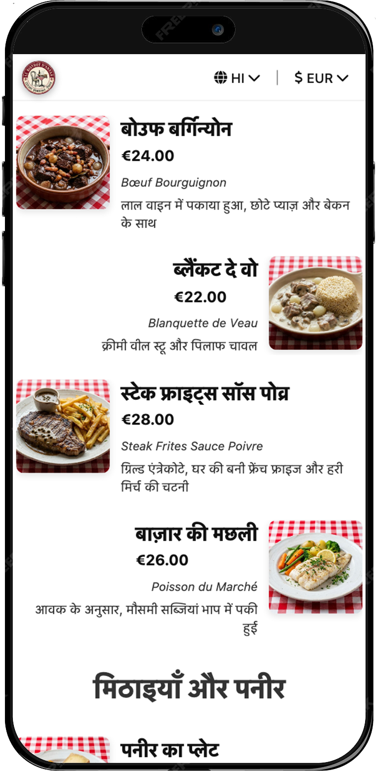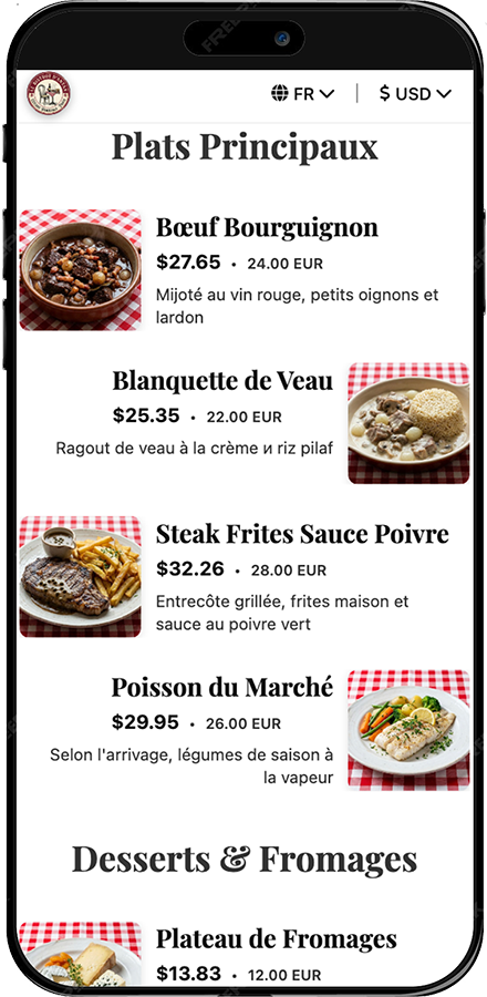 Los PDF son incómodos en el móvil. Un menú digital está hecho para smartphones, soporta traducciones y permite actualizar platos en tiempo real.